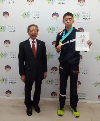 8月に行われた水泳の全国大会で優勝した添田重樹さんが伊勢原市役所に表敬訪問へ行きました!