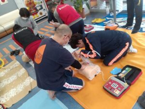 心肺蘇生法、AED、バックバルブマスクの使用方法など 実技指導を受け、救助に関する知識のアップデートを行いました。