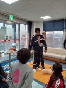 喉に異物を詰まらせてしまった場合の対処法「ハイムリック法」 の指導を受ける様子です。