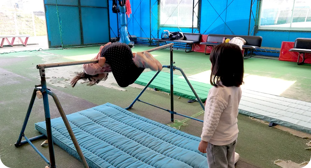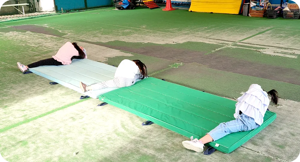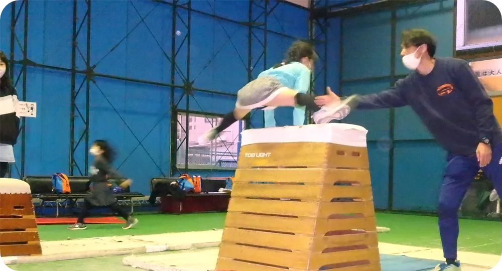 走る・飛ぶ・投げるといった基本的な運動から始め、縄跳び、跳び箱、鉄棒、マット運動などの器械体操の技術習得を目指します。練習は、子どもたちがお友達と協力し合い、互いに励まし合いながら楽しく取り組めるよう工夫しています。一人一人が自信をつけ、チャレンジ精神を育むことを大切にし、達成感を感じられるような指導を心がけています!