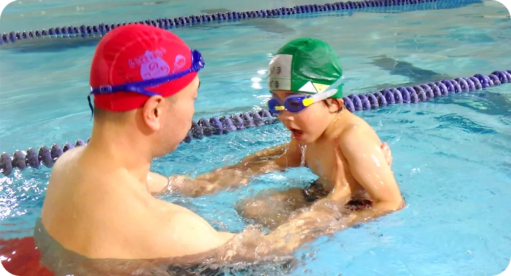 お水に慣れていただくために水中歩行から練習を行い、顔洗い・顔付け・もぐり・呼吸動作などの練習を行います。少しずつ段階を踏んで、浮き身・バタ足・背面キックなどを行います。