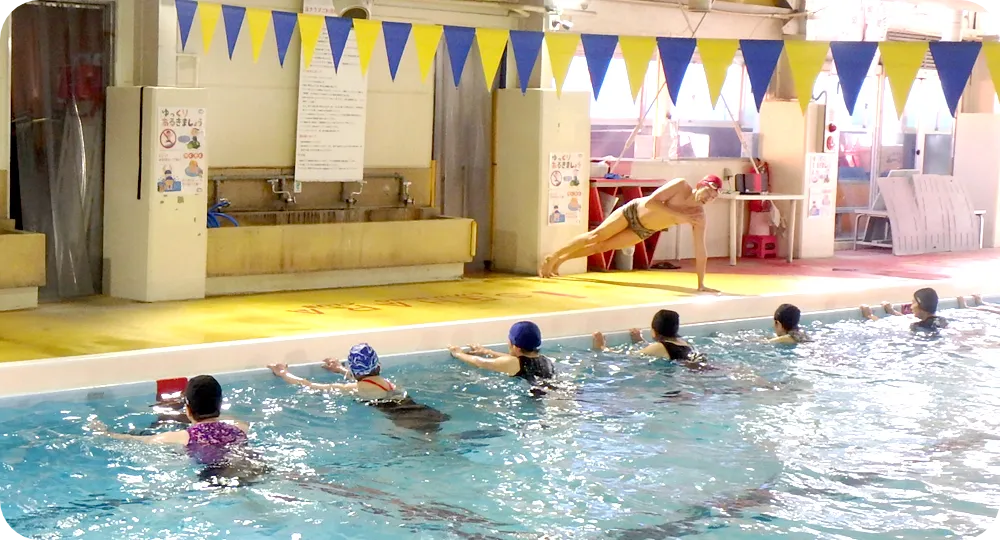仕事で昼間は来られない方でも来る事のできる夜の時間に常にレッスンを行い、初めての方からマスターズ大会出場の方まで、健康増進とともに4泳法を学んでいきます。